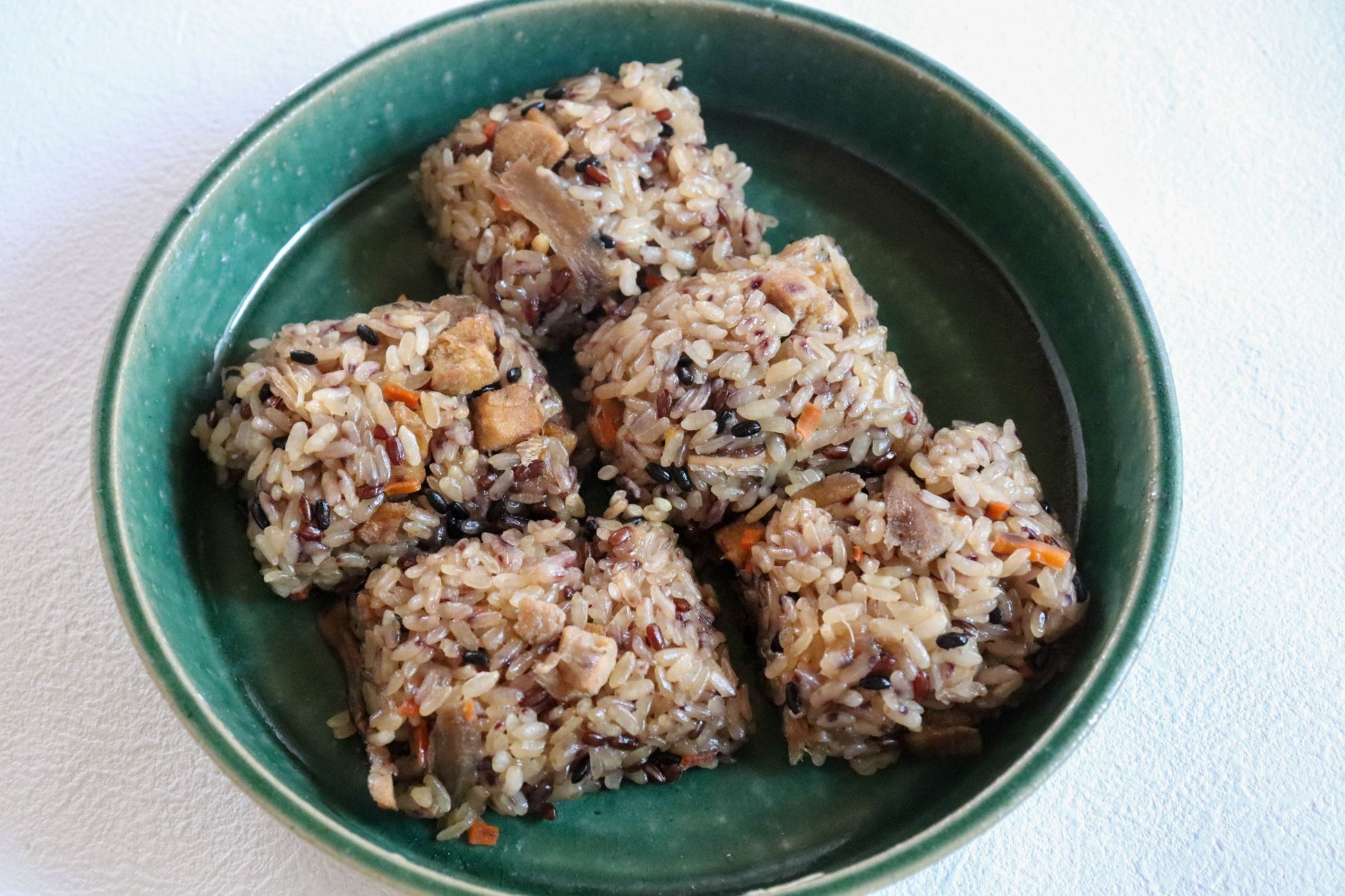 100%国産もち米を使用したおこわに、赤米と黒米の2種類の古代米に国産原料のごぼう、人参、鶏肉、生姜、椎茸の5種の具材をゴロゴロ加えました。