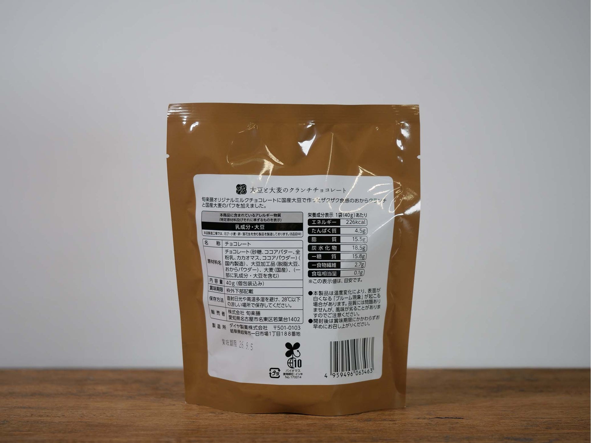 | 原材料名 | チョコレート(砂糖、ココアバター、全粉乳、カカオマス、ココアパウダー)(国内製造)、大豆家屋品(脱脂大豆、おからパウダー)、大麦(国産)、(一部に乳成分・大豆を含む) |