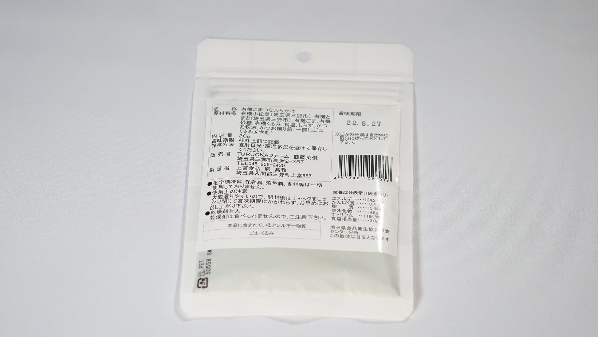 | 原材料名 | 有機小松菜(埼玉県三郷市)、有機とまと(埼玉県三郷市)、有機ごま、有機砂糖、有機くるみ、食塩、しらす、かつお粉末、かつお削り節(一部にごま、くるみを含む) |