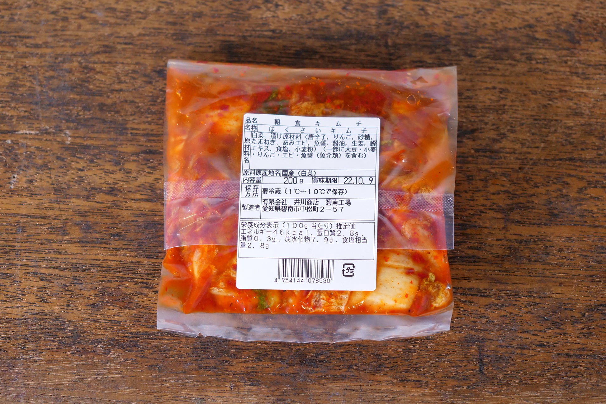 | 原材料名 | 白菜、漬け原材料(唐辛子、りんご、砂糖、たまねぎ、アミエビ、魚醤、醤油、生姜、鰹エキス、食塩、小麦粉)(一部に大豆・小麦・りんご、えび・魚醤(魚介類)を含む) |